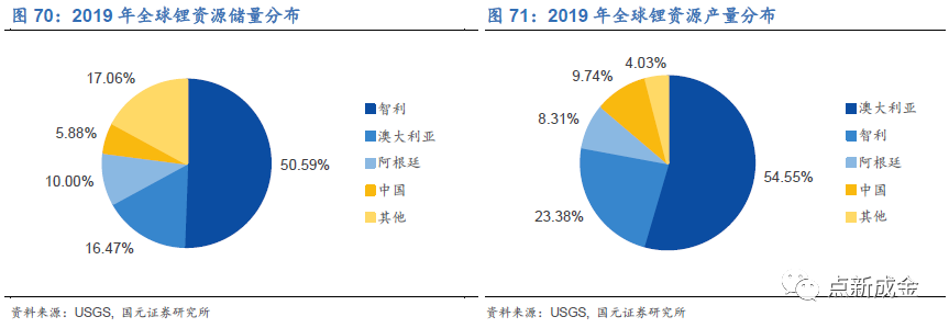 全球锂资源储量丰富,以南美盐湖、西澳锂矿、中国盐湖为主。据美国地质调查局(USGS)数据显示,2019年全球锂资源储量约1700万吨,主要分布在智利(50.59%)、中国(17.06%)和澳大利亚(16.47%)等国。其中南美地区(智利、阿根廷和玻利维亚)锂资源主要为盐湖卤水型,澳大利亚主要为锂矿型。中国是两者皆有,主要分布于青海、西藏、新疆、四川、江西和湖南等地区。