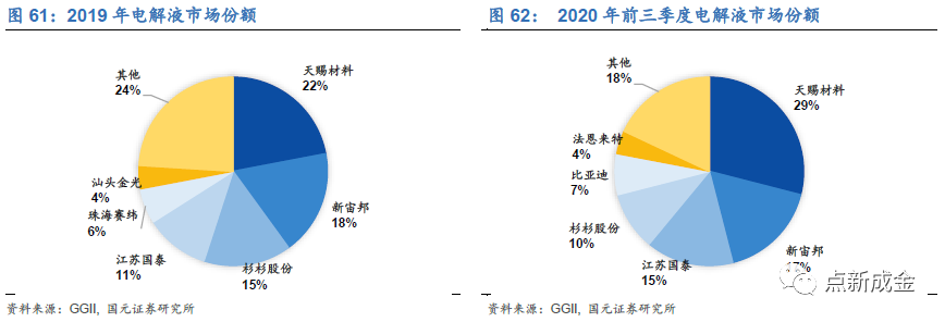 龙头集中趋势明显,未来持续受益于景气周期。2017至2019 年,前五大厂商占比分别为61%、68%、72%,2020年前三季度提升至78%,龙头集中度明显增加。2020年前三季度天赐材料、新宙邦、江苏国泰三家占比分别为29%、17%、15%。电解液经过前期激烈竞争,盈利情况处于较低位置,尾部企业逐渐出清,随着六氟和溶剂涨价,电解液价格将逐步回升。此外,头部电解液公司大规模应用成本更低的液体六氟将放大盈利优势,未来将持续受益于景气周期。