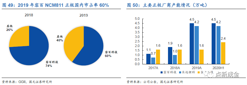 NCM811正极材料厂商较少,容百科技拥有绝对份额。NCA正极国内参与较少,海外市场主要为住友金属、日本化学与户田化学所垄断。国内市场仅有贝特瑞布局(约3000吨)。国内能够实现NCM811量产的厂商主要有当升科技、容百科技、天津巴莫、杉杉能源等少数厂商。其中容百科技2019年与2022年市场份额为74%,60%。截至2020上半年三元正极产能4.5万吨,以NCM622、NCM811为主,产能规模领先。