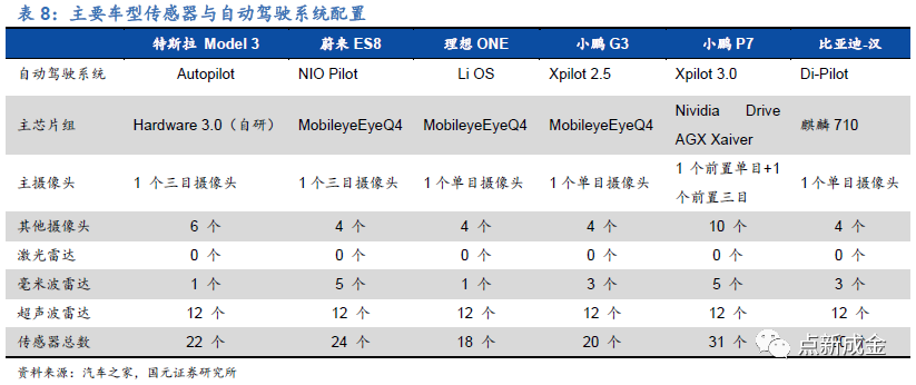 “智能电动车”作为全新的品类逐渐被消费者认知,智能化成为产品差异化竞争的核心策略。智能化的标签也不断提升公司的产品力和品牌力。当前主要的电动智能标签的热门车型所有在售车型都标配众多传感器、芯片算力、识别系统等,硬件的冗余方便后续的智能化升级。特斯拉用高性能芯片将用来控制和支撑特斯拉的自动驾驶系统、动力传递和车辆娱乐等功能,打造高性能电动车和自动驾驶两大核心竞争力。2020年发布的小鹏P7所搭载的14颗200万像素摄像头+5颗博世第五代毫米波雷达+英伟达Xavier 30 Tops算力自动驾驶芯片组合被视为行业解决方案领军者。