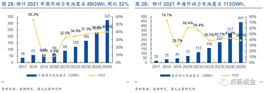 预计2021年全球动力电池需求202GWh,其中国内动力电池需求89GWh,同比32%,海外需求113GWh,同比增长56.4%。新能源车供给端的产品丰富对电池需求的影响体现在两方面,一方面纯电动车型品类丰富,另一方面高级别车型种类比例上升。与此同时,消费者对长续航的需求推升单车带电量,海外纯电动商业车渗透加快,也将进一步促进电池需求增长高于电动车销量增长。
