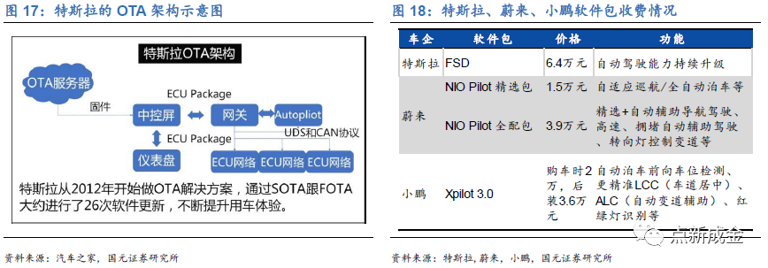 智能化的重要标志是保持软件的先进性、易用性,而FOTA是唯一途径(Firmware Over-the-Air,移动终端的空中下载软件升级)。通过FOTA,车企也改变了只靠硬件盈利的模式,变为硬件与软件共同盈利,车辆增加值提升。特斯拉对国内销售的所有车型的FSD(完全自动驾驶)选装包价格进行了上调,相比之前5.6万元的售价上涨了8000元,现售6.4万元。蔚来自动辅助驾驶系统NIO Pilot不断完善升级,目前包括3.9万元的全配包和1.5万元的精选包。小鹏的Xpilot 3.0软件购车时价格2万元,后期加装需要3.6万元。