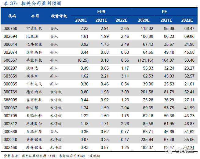 1)全球锂电龙头持续溢价及二线玩家客户突破,关注宁德时代、亿纬锂能、国轩高科、孚能科技、欣旺达。2)关注供需变化及产品价格趋势性企稳回升带来的盈利改善:正极环节,德方纳米、容百科技;负极,关注璞泰来,中科电气;电解液(六氟磷酸锂)环节,新宙邦、天赐材料;隔膜:恩捷股份、星源材质;锂盐:盛新锂能、赣锋锂业。