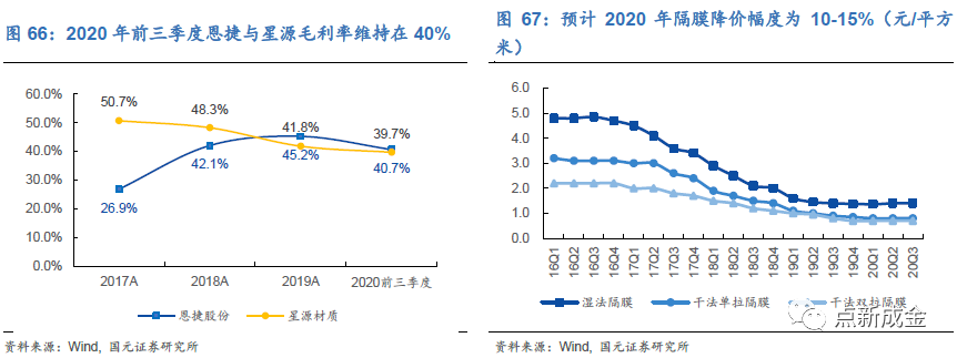 星源材质盈利能力显著提升。折旧成本在隔膜成本中占比近3成,星源在湿法隔膜产品均价下降28.74%至1.24元/平方米的背景下,平均成本下降至0.75元/平方米,毛利率提升至39.73%。19年隔膜降价25-30%,目前湿法基膜半成品价格1.4-1.6元/平;由于行业新产能释放,20年隔膜降价幅度预计为10-15%,而龙头恩捷成本0.7-0.8元/平,毛利率仍有40%以上。