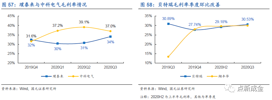 负极盈利能力有望迎来明显改善。1)预计随着内蒙兴丰产能投产,璞泰来可实现50%以上的石墨化加工内供、并可节省对应0.4-0.5万元/吨的加工成本,后续随着碳化产能满产以及原料端降本探索,盈利空间有望进一步释放。2)中科电气三季度均价由于受性价比产品的占比上升有所下降,但公司通过石墨化及降本增效措施,负极毛利率依旧维持在高位。Q3负极吨净利预计为6300元,环比微跌,公司8月份新投产1万吨石墨化产能,Q3产能持续爬坡,目前石墨化自给率高达60%,降本增效空间较大。3)贝特瑞负极覆盖全球锂电龙头,公司规模优势显著,产品配置合理,毛利率始终保持在30%左右,盈利能力良好稳定。4)翔丰华对LG快速放量,预计对三星2021年批量出货,产品与产能布局均衡,公司量利均在上升通道。