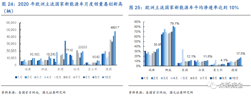 预计欧洲2020年销量112万辆,2021年达到178万辆,同比增长59%。欧洲10月销量13.8万辆,除8月为消费淡季,下半年来屡创新高。主要销量市场国家英国、法国、德国、意大利、瑞典、挪威新能源渗透率分别达到12.1%、11.8%、17.5%、4.1%、35.9%、79.1%,平均渗透率达到10%。预计全年维持在112万辆及以上。产品端除了当下畅销的雷诺Zoe、标致208 EV、大众e-高尔夫此类两厢新能源车以外,有更多的A及A00级别车型上市,产品端的丰富进一步刺激潜在需求,预计2021年销量同比增长59%,达到178万辆。