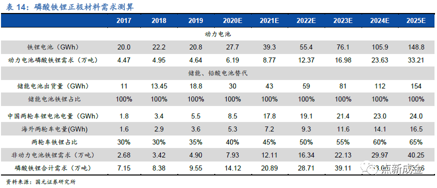 预计2025年磷酸铁锂正极材料需求73.46万吨,其中动力电池磷酸铁锂正极材料需求约33.21万吨,非动力电池需求约40.25万吨。2020-2025年CAGR为50.4%。