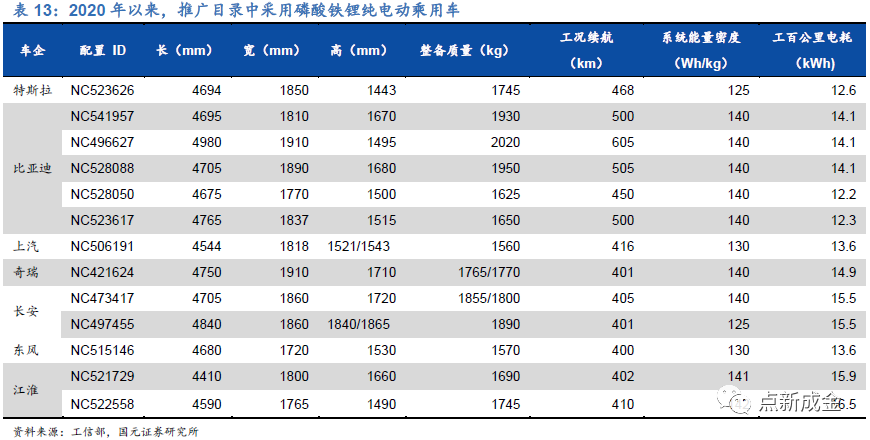 爆款车型引领技术分化,磷酸铁锂重回正增长的趋势有望持续。磷酸铁锂装机占比提升率先由爆款车型特斯拉Model 3、比亚迪汉、宏光mini推动。不完全统计,年初以来登上工信部推广目录中的纯电铁锂车型包括江淮iEV6e/iEVA50、奇瑞eQ、北汽EU300、江淮大众思皓E20X等车型,磷酸铁锂产品系统能量密度水平已达到三元版本的140Wh/kg左右的水平,续航里程超过400km,已经满足A级运营车需求,同时私人消费市场有望凭借价格优势拓宽销路。比亚迪刀片电池2020年产能规划20GWh,计划21年主要产品均换装铁锂。在Model 3的示范效应下,更多合资厂商有望推出铁锂版本车型,磷酸铁锂在乘用车领域占比修复,装机总量有望重回增长。