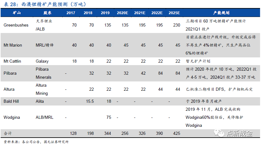 预计2020年西澳锂矿碳酸锂产能下降88万吨,至2025年回升至425万吨。受库存持续攀升和现金流的压力,预计未来矿区会将降本增效作为企业核心竞争点。2020年除Greenbushes进行了二期项目的爬产,因受其他大多矿山减产、停产、破产等影响,预计2020年西澳锂矿供给将进一步下降。同时,受新冠肺炎疫情和目前锂盐价格处于低位的影响,原有的产能规划也可能被迫延迟。因此,我们预计目前新增的产能未来不会对市场造成很大的影响。