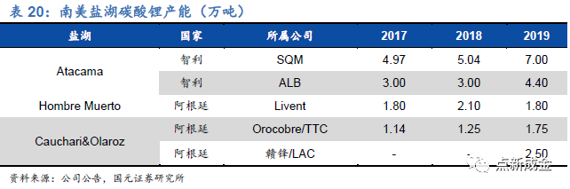 南美盐湖的碳酸锂产能集中在智利与阿根廷。南美“锂三角”(智利北部、阿根廷北部、玻利维亚西部)拥有全球主要的盐湖锂矿床,其在资源品位、开采难度及成本方面具有得天独厚的优势。该地区囊括了著名的四大盐湖:Atacama(智利)、Hombre Muerto(阿根廷)、Cauchari-Olarzoz(阿根廷)和Olaroz(阿根廷)。主要源头掌握在SQM、ALB、Livent等公司手中。