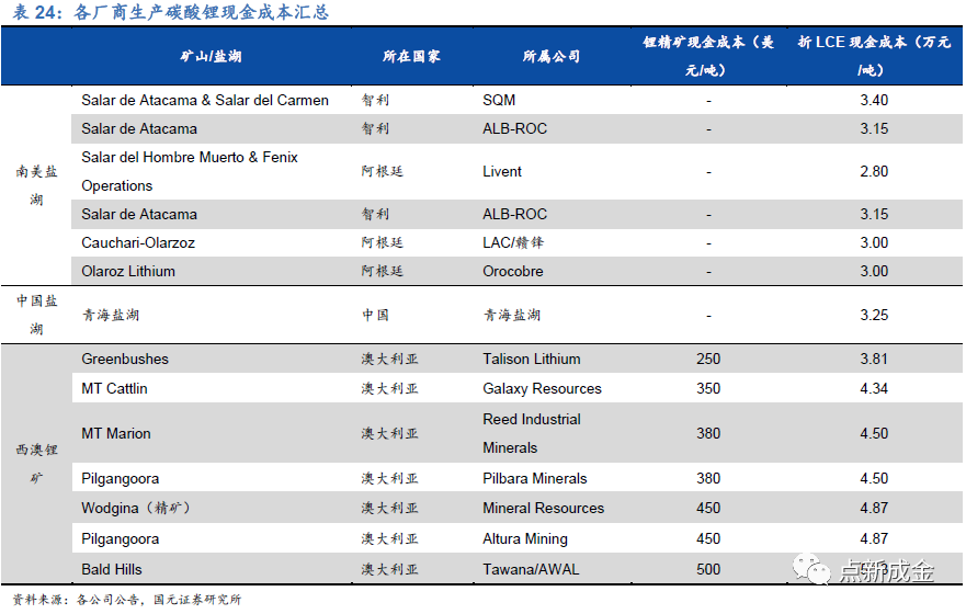 碳酸锂价格下行时,西澳锂矿率先面临经营压力。从成本线来看,按照目前4.5万元/吨的碳酸锂售价,只有Greenbushes、Mt Marion这两座成熟矿山具有一定的成本优势,且分别与天齐、ALB和赣锋、MRL有稳定的包销渠道,因此尚未面临明显的经营压力。Livent旗下的阿根廷Hombre Muerto 盐湖具有高锂浓度、低镁锂比等得天独厚的优势,且率先实现选择性吸附法的工业化,其碳酸锂生产成本为2.8万元/吨,是唯一生产成本低于3万元/吨的盐湖。