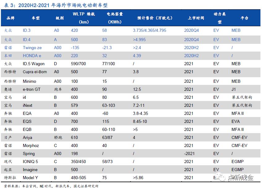 从欧洲市场来看,欧洲主要上市的新车型中西雅特Minimo、奔驰EQA、本田e等均具备较大潜力,全新MEB电平台首发车型ID.3欧洲起售价37,350欧元,WLTP标准续航里程420km,至2019年12月欧洲订单已达3万辆,2020年9月起正式交付,有望成为四季度和2021年重要畅销车型。