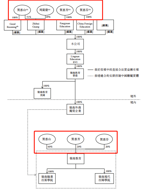 公司架构方面,公司主要股东贺惠山先生及周兰庆女士拥有控股公司ZhihuiGuang51%及49%,并且周兰庆女士为贺惠山先生的配偶。贺惠山同时也是另外的主要股东贺惠芳、贺惠芬的胞兄,贺惠山、周兰庆、贺惠芬、贺惠芳四人为一致行动人。由此可见,岭南教育主要以家族式经营,这正是港股市场最厌恶的股权结构之一。