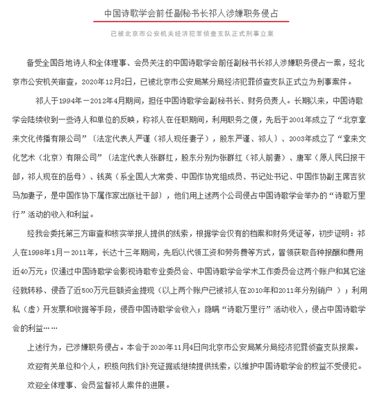 中国诗歌学会6日通报,中国诗歌学会前任副秘书长祁人涉嫌职务侵占一案,已被正式立案。