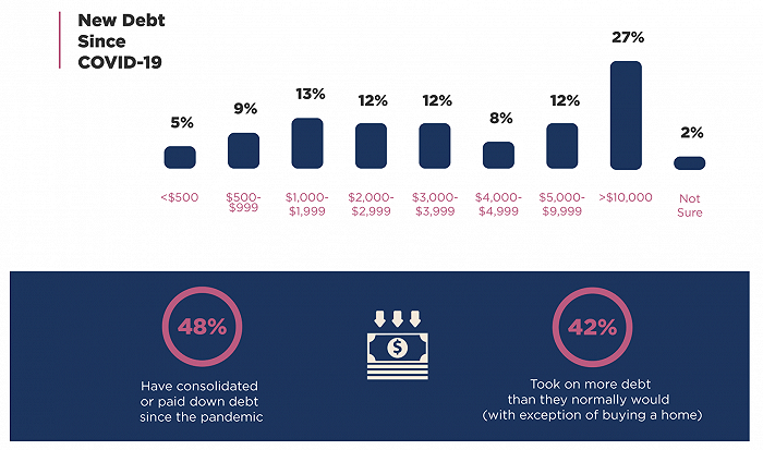 更值得担忧的是美国普通消费者的负债情况。疫情期间新增负债超过1万美元的受访者比例超过四分之一,同时在低利率刺激下超过四成的受访者表示,会较往常背负更高额度的房贷。