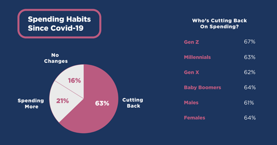更加谨慎的心态也对美国消费者心理产生了影响,仅有37%的受访者表示疫情期间整体花销与过去持平或有所增加,各个年龄段表示“支出减少”的比例均在60%以上。更加谨慎消费(60%)、收入/薪水减少(49%)、宅家时间更长(40%)、失业(17%)、配偶失业(16%)都是引发消费者更少花钱的理由。