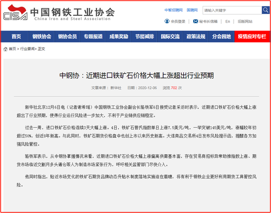 昨日,中国钢铁工业协会副会长骆铁军在接受记者采访时也表示,近期进口铁矿石价格大幅上涨超出了行业预期,使得行业运行风险进一步加大,不利于产业链供应链稳定。