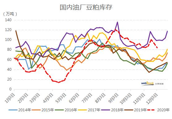 因豆粕胀库停机油厂增加,国内大豆压榨量继续下降,令油厂豆粕库存连续第二周减少,截止12月4日当周,国内沿海主要地区油厂豆粕总库存量83.89万吨,较上周的92.44万吨下滑9.25%,不过仍处于多年同期高位,仅低于2018年库存量。