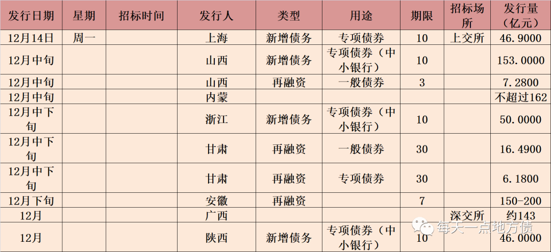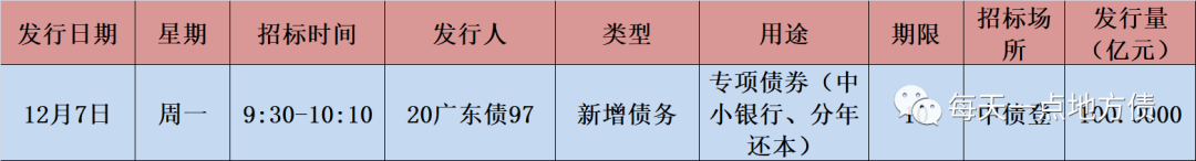 截至目前,下周仅公布了12月7日广东1只10年期(分期还本)新增中小银行专项债券100亿元,在中债登发行。
