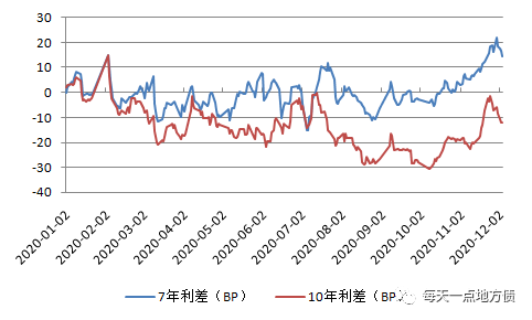 从7年和10年的走势图可以看出,10年利差除了在2月初有过短暂的正值,今年大部分时间为负值;相比之下7年利差为正的时间段要多很多,特别是10月以来7年期的配置吸引力继续增强。