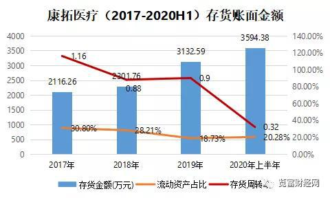 2017年至2019年,康拓医疗的存货金额分别为2116.26万元、2301.76万元、3132.59万元,占流动资产的比例分别为30.80%、28.21%、18.73%。2020年上半年数据分别为存货3594.38万元,占比20.28%。