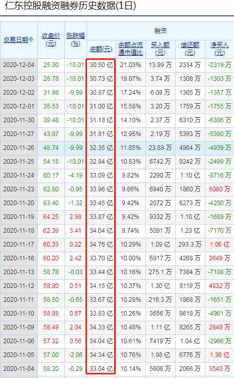 截至12月4日,仁东控股融资余额仍有30.5亿元,净买入额已经连续9日为负值。上述余额超过六成在今日收盘价上方形成,今日收盘价已经跌回3月31日价位,彼时融资余额为8.26亿元。