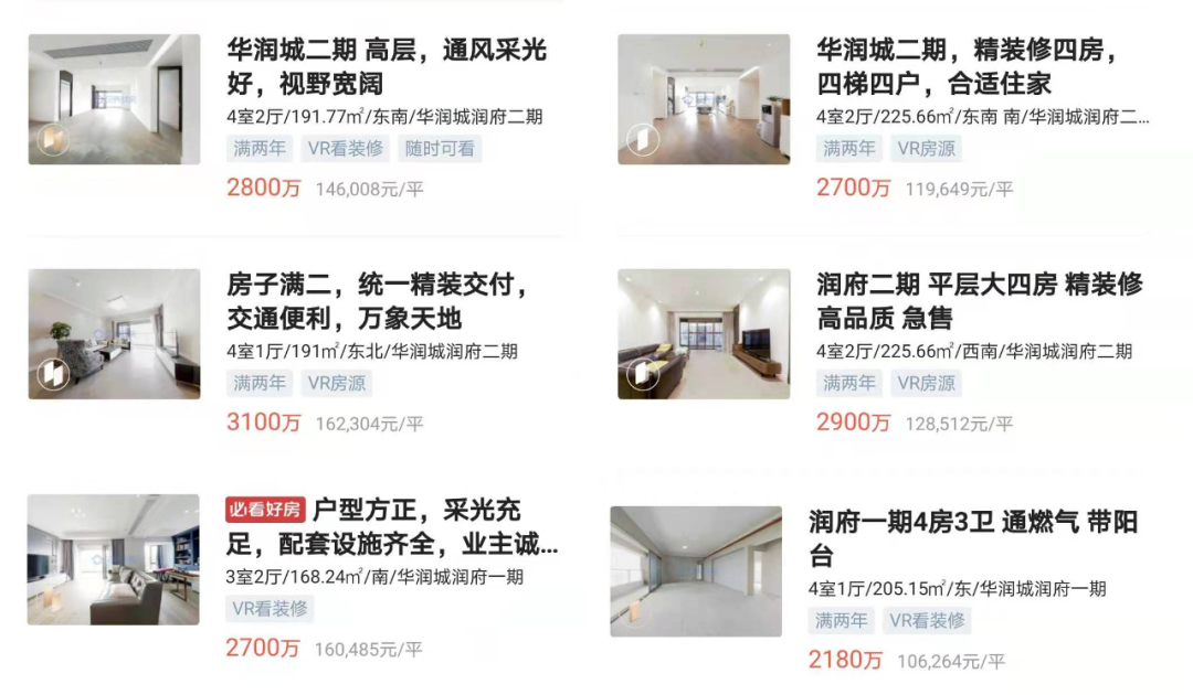 查阅贝壳找房APP,华润4的“哥哥们”华润城润府一、二、三期二手房的挂牌均价在17.1-18.5万/平。也就是说,新房源华润4的均价与周边二手房的挂牌均价出现了4-5万元/平的倒挂,意味着如果抢到一套100平米的最小户型,也能直接获利近500万。正是在这样的“套利”预期之下,华润4开盘出现了火爆的场面,人们戏谑,深圳千万以上的豪宅被抢成了似乎为白菜价的刚需盘。但是仔细看一看贝壳找房挂牌的在售二手房源会发现,户型越大,单价越低,超过200平米左右的华润城润府一、二期,挂牌价还不到13万/平。