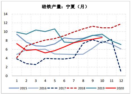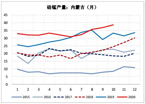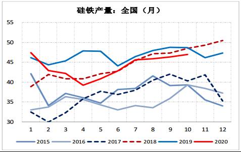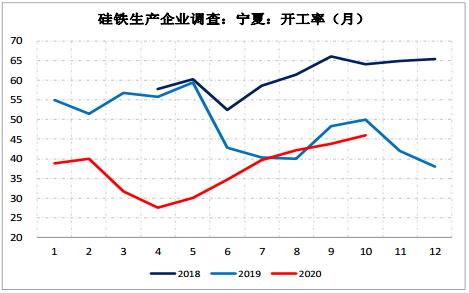 2020年10月统计全国硅铁主产区企业约128家,10月全国硅铁产量为46.90万吨,较9月增加0.61万吨,较去年同期降1.7万吨。月初开工率及产量都有小幅上升趋势,供应端呈现缓慢上升态势,陕西新炉子开始投产,11月的钢厂招标上涨、原料兰炭、硅石等价格均表现坚挺。前期环保禁令影响硅石产量,且兰炭等原料价格持续上涨,硅铁生产成本支撑相对上移。月中陕西区域新炉子在缓慢投放市场,市场主要的产量增量集中在陕西区域。硅铁供应端开始呈现增长趋势。据了解,内蒙、青海、甘肃等没货,排单生产叠加下游需求表现坚挺的情况下,厂家信心较好,进入11月末之后,这个情绪继续加剧,宁夏中卫地区个别工厂排单至12月,进入到下半年,硅铁企业的开工进入一个持续增加的状态,特别是陕西地区产量一直增加,此外原料兰炭价格涨价明显,比今年最低价格上涨200-250元/吨。目前现货偏紧,成本支撑较强,12月钢厂招标预期呈上涨趋势运行,硅铁价格会维持上涨态势。