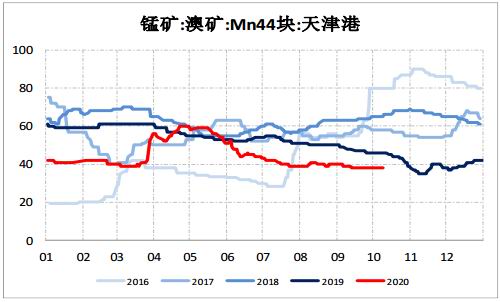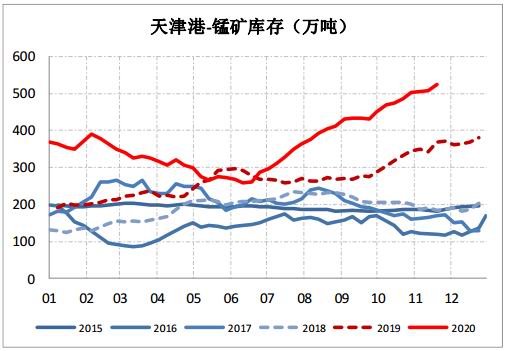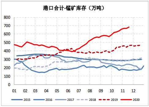 锰矿方面:截止2020年1-10月中国进口锰矿总量2546.16万吨,同比减少7.85%,2020年1-10月从南非进口总量为1057.96万吨,同比减少1.72%,2020年1-10月南非进口量占中国总进口量的41.55%。11月周度港口库存总计平均670万吨创新高,环比上月增44万吨。天津港库存合计月均514万吨,钦州港库存合计月均146万吨高位运行。短期受北方下雪天气影响,天津地区疫情反复,会不会影响天津锰矿出港暂未有消息,从政策上看暂时未有封港政策。不排除厂家会适量增加厂家锰矿库存。近期硅锰对锰矿已经难以形成有力支撑,随着钢招入场,北方入冬,矿种间的差异性也将逐步显现,临近年末,高港口库存压力下,矿商出货压力必然不小,锰矿下行的趋势难以改变,但由于矿价已经跌破成本,矿价能回调的空间有限。