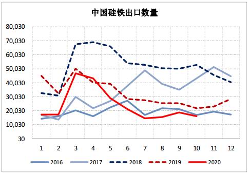 硅铁:据海关数据,2020年10月中国含硅量大于55%硅铁出口量为14237.968吨,较9月减少3308.068吨,环比下降18.85%。较去年同期19751.7吨减少5513.732吨,同比下降27.92%。2020年1-10月总出口量为223557.643吨。出口方面依旧表现相对疲软,金属镁维持稳健,整体来看,市场现货紧张,厂家库存一直处于低位,硅铁市场呈上涨趋势运行,因下旬期货盘的大幅拉涨,市场情绪好转;叠加内蒙宁夏大厂价格上调;另外工厂排单生产,市场现货偏紧;原料兰炭继续上涨,神木市兰炭集团发布通知表示将从28日起上调兰炭小料出厂价至780元/吨,较月初涨80元/吨,多重利好因素叠加,工厂信心好转,报价维持坚挺。