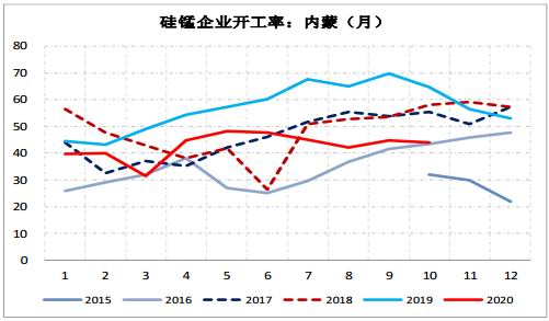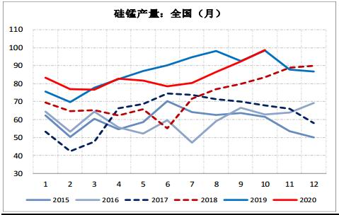 10月硅锰产区121家生产企业,开工情况如下:10月全国综合开工率为:67.1%,较之9月增加2.9%。全国10月产能1584791吨,产量985732吨,环比9月增6.73%,较之9月量增加62194吨,同比2019年10月产量增0.6%。2020年1-10月累计产量8373672吨,同比减3.4%。月初开工有所降幅,主要由于云南区域开工降幅较大,影响全国整体开工率下降,而北方仍有新开工企业出产,导致整体产量维持增加态势。南方省份电价有所上涨,低利润下南方工厂有停减产计划。月中云南等南方区域电费增加,部分南方中小企业有所减产,而北方内蒙区域中小企业仍受限电影响,产量也有所小幅下调,但大厂开工相对稳定。下旬内蒙某地区每天限电7小时,导致部分工厂产量一定程度减少,工厂现货库存仍处于低位,现货供应也将减少,南方开工率也有所下行,当地工厂仍处于排单生产状态现货较少。近期原料价格有所上涨,且临近冬储以及北方迎来雨雪天气,运费涨价预期存在,短期认为硅锰价格或有所上涨空间,目前硅锰社库依旧较大,且持续处于供大于求的态势,短期存在利好支撑,但后期价格反弹空间依旧有限。