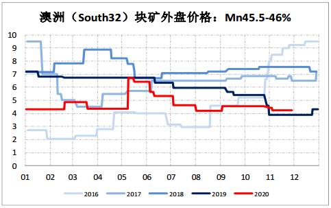 Mysteel:South32公布二轮对华锰矿装船报价Mn45%澳块报价为4.42美元/吨度,较一轮下调0.08美元/吨度;南非半碳酸锰矿报4.1美元/吨度,较一轮下调0.2美元/吨度。UMK2021年2月对华锰矿实际成交价格:Mn36%南非块3.69美元/吨度,较2020年12月报价下调0.56美元/吨度,较12月实际成交价下调0.36美元/吨度。