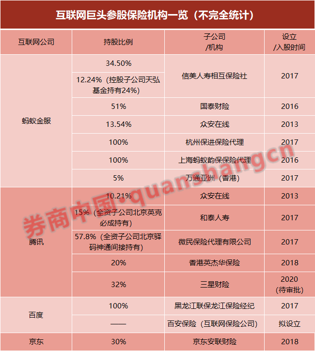 近年,通过设立或者收购等股权投资方式,BATJ等互联网巨头积极向保险领域渗透。除了腾讯,蚂蚁金服也投资了多个保险实体,同时在业务拓展上坚持以“保险科技”为连接器,与保险公司深度融合、互为生态。