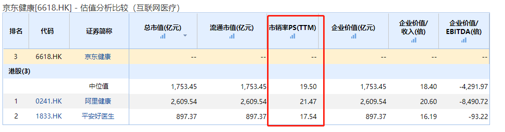 由于京东健康是目前上市的互联网医疗板块中唯一盈利的,所以对于三家公司比较选用市销率(总市值除以主营业务收入)这个指标。