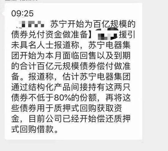 今日同业传闻:苏宁集团资金链断裂,在渤海银行的贷款已经违约,民生和建设银行已抽贷,上周苏宁逼着光大银行进行展期。目前苏宁正在通过民间借贷筹集资金(券商资管发产品,卖给散户)。昨天多家银行收到紧急通知,今天飞北京签署保密协议,然后开会讨论苏宁的风险化解方案。