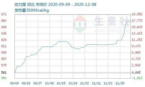根据生意社数据,动力煤近期涨幅较大,近一周时间内,河北市场上的动力煤均价涨幅高达6.21%,且涨价势头不减。在期货市场,动力煤主力合约2101开盘于701元/吨,最高价714元/吨,收盘于693.6元/吨,较上一交易日上涨0.73%。