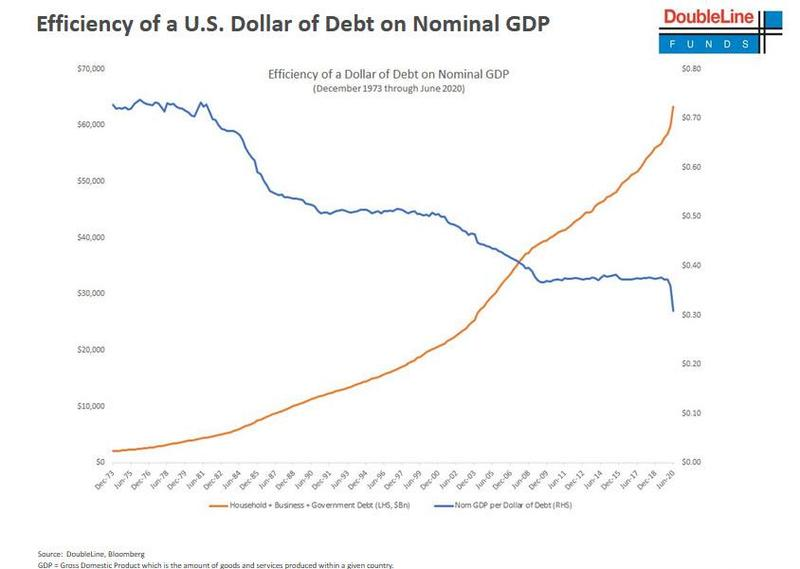 冈拉克此次网络直播标题是“看不到尽头”,他解释,这一标题指的是“美国公共债务看不到尽头”,暗指央行为了支撑股票市场释放无止境的流动性,从而扩大贫富差距。他指出,过去发行1美元债券可以带来大约1美元的GDP,然而目前仅有大约0.30美元。