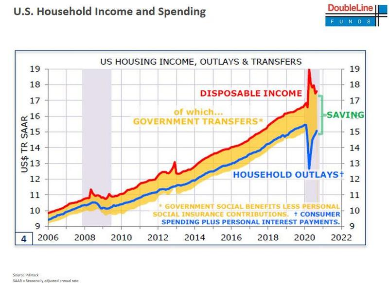 此外,冈拉克还指出,广义货币供应量激增,但是货币流通的速度越来越慢。还有一对出现巨大差距的指标是可支配收入和支出,家庭可支配收入在增加,支出却在放缓,这导致了创纪录的储蓄。其中政府补贴占家庭收入的比重在今年也猛增至近四分之一。