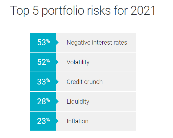 法国外贸投资管理公司(Natixis )最近发布的《机构投资展望》调查显示,80%的机构投资者认为,市场低估了COVID-19疫情对经济的长期影响;另外,负利率、波动性、信贷紧缩、流动性、通胀,被认为是2021年投资组合中5个最大的风险。