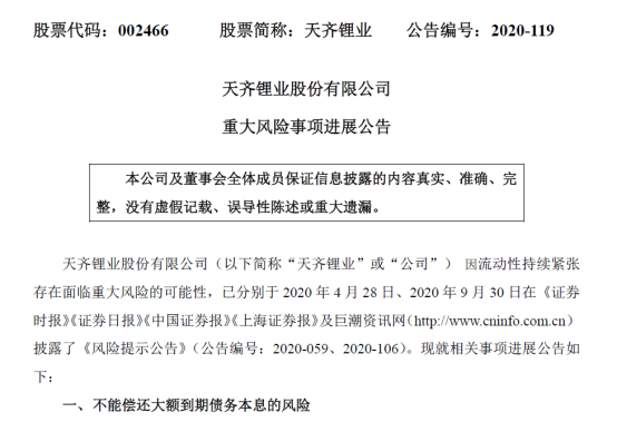 此次交易获得资金用途“用于偿还银团并购贷款本金12亿美元及相关利息”,而在11月14日,天齐锂业发布公告“自爆”债务危机。