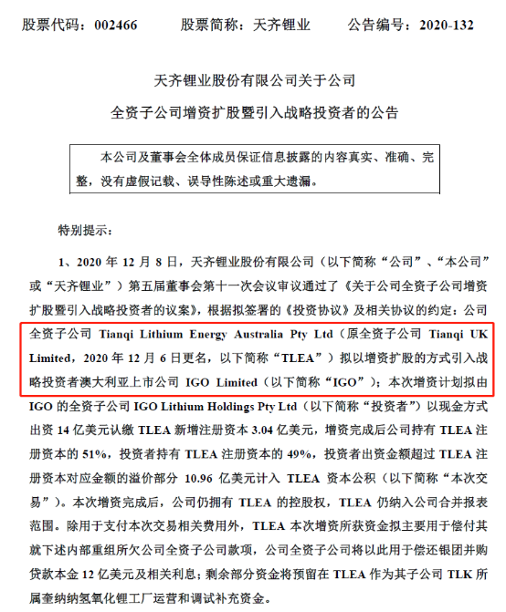 12月8日晚间,天齐锂业发布重磅公告,董事会通过《关于公司全资子公司增资扩股暨引入战略投资者的议案》。