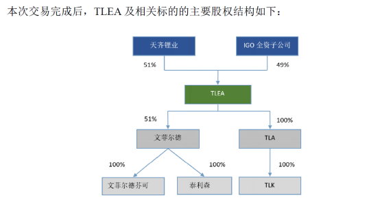 据悉,本次增资计划拟由IGO的全资子公司以现金方式出资14亿美元认缴TLEA新增注册资本3.04亿美元,增资完成后公司持有TLEA注册资本的51%,IGO的全资子公司持有TLEA注册资本的49%,IGO的全资子公司出资金额超过TLEA注册资本对应金额的溢价部分10.96亿美元计入TLEA资本公积。公告称,本次增资完成后,天齐锂业仍拥有TLEA的控股权,TLEA仍纳入公司合并报表范围。