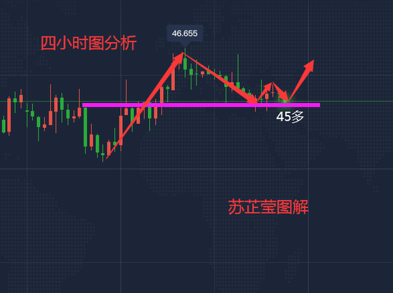 原油继续维持在窄幅震荡走势当中,上方压力46美金,下方支撑45美金,并且连续两次下攻45美金支撑不破,整体依然是偏多走势,日内原油操作苏芷莹回踩45附近多。