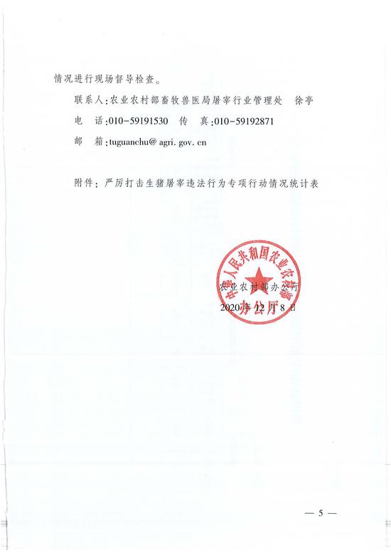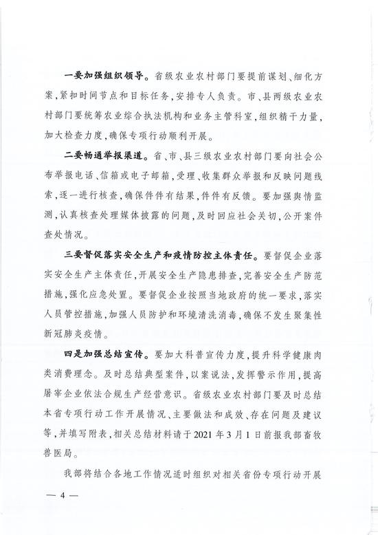 四是加强总结宣传。要加大科普宣传力度,提升科学健康肉类消费理念。及时总结典型案件,以案说法,发挥警示作用,提高屠宰企业依法合规生产经营意识。省级农业农村部门要及时总结本省专项行动工作开展情况、主要做法和成效、存在问题及建议等,并填写附表,相关总结材料请于2021年3月1日前报我部畜牧兽医局。