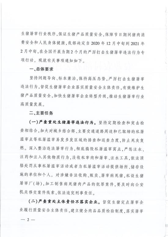 今年以来,各地通过开展农产品质量安全专项整治“利剑”行动,查办了一批屠宰环节违法案件、捣毁了一批私屠滥宰窝点、销毁了一批问题产品,有力支持了全国非洲猪瘟防控和生猪生产恢复,有效保障了生猪产品质量安全。随着冬季,特别是元旦春节消费旺季的到来,猪肉产品消费将进入高峰期,从近期各地案件查办情况看,私屠滥宰等屠宰环节违法案件呈上升趋势。为切实维护生猪屠宰行业秩序,保证生猪产品质量安全,保障节日期间猪肉消费安全和人民身体健康,我部决定自2020年12月中旬到2021年2月中旬,在全国开展为期2个月的严厉打击生猪屠宰违法行为专项行动。现就有关事项通知如下。