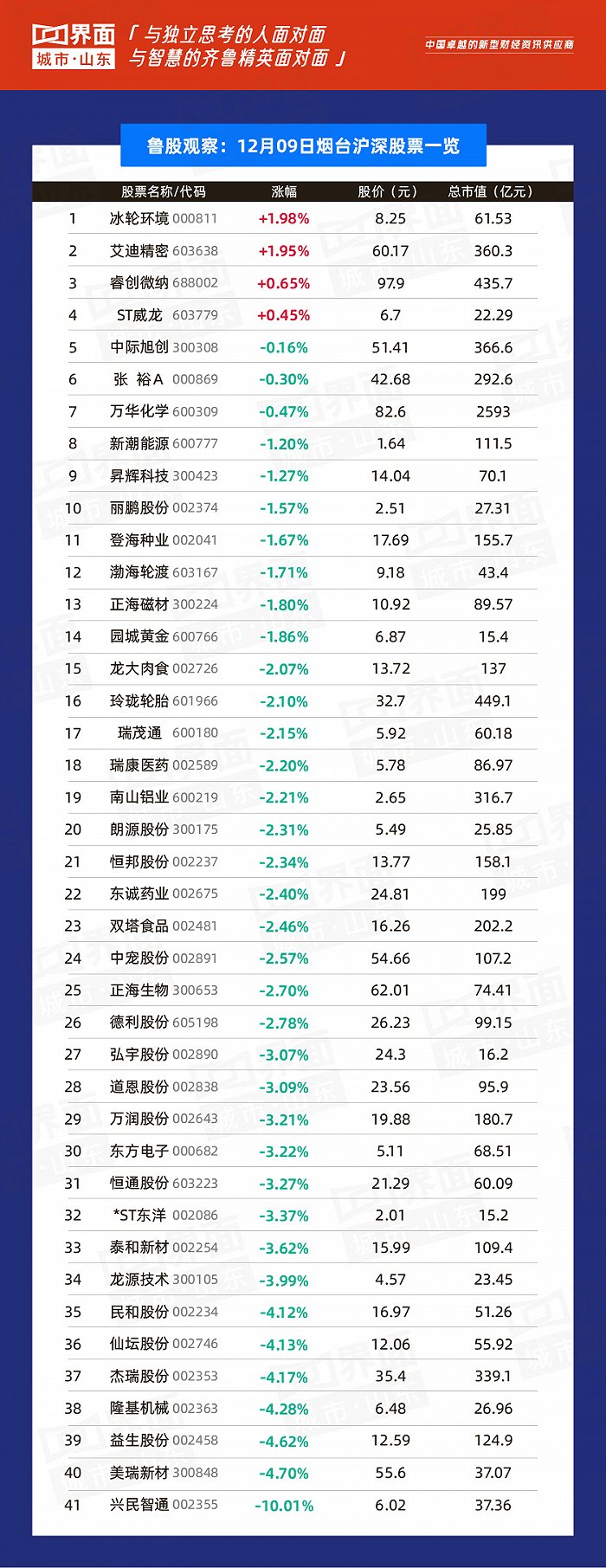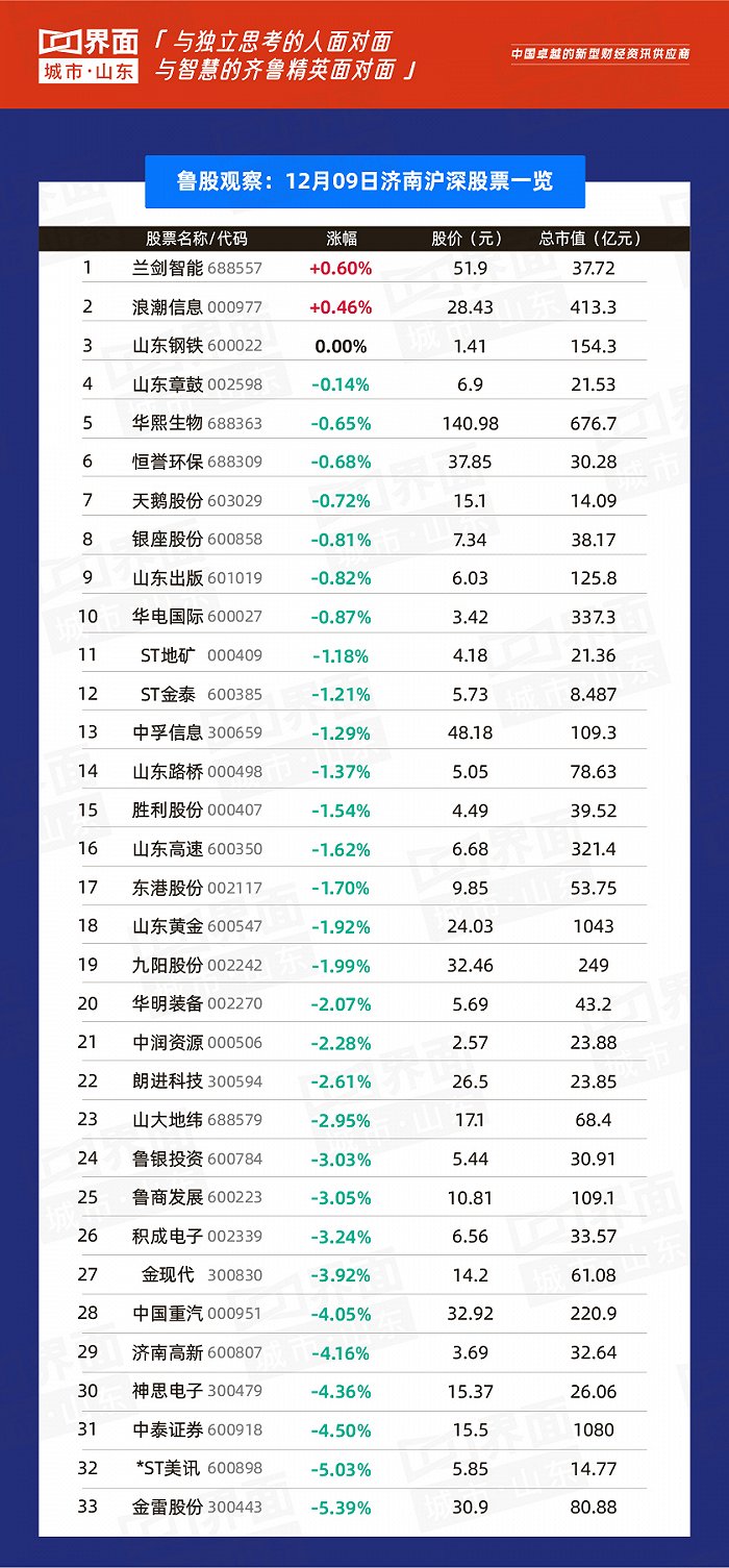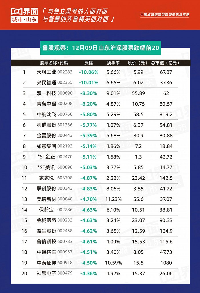 原标题:鲁股观察 |12月9日:天润工业、兴民智通跌停,全省仅29只个股上涨