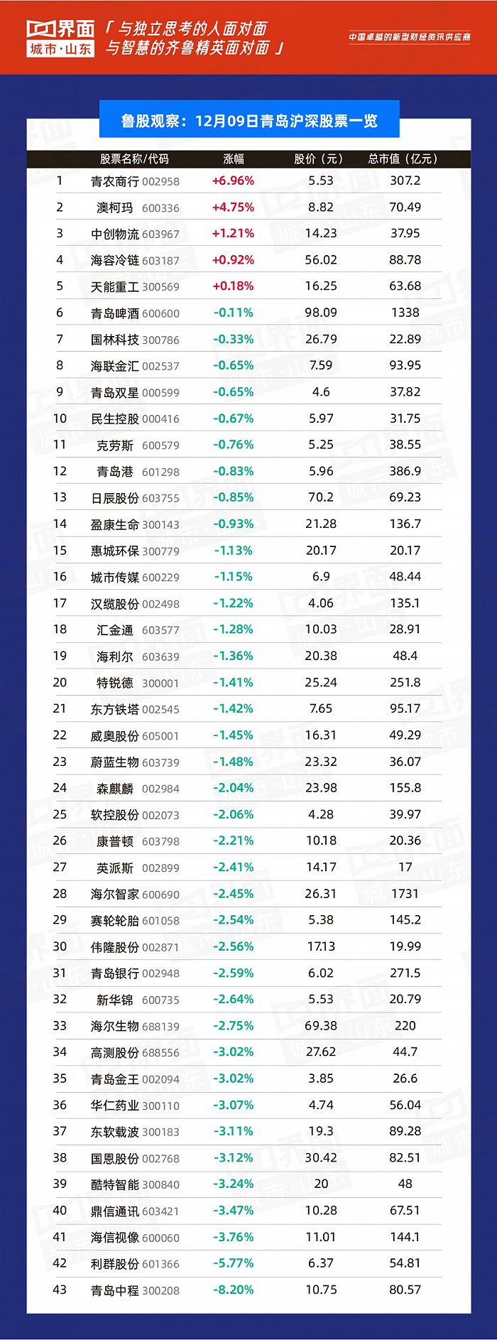 青岛市涨幅榜首:青农商行(002958),涨幅6.96%,股价5.53元,总市值307亿元;