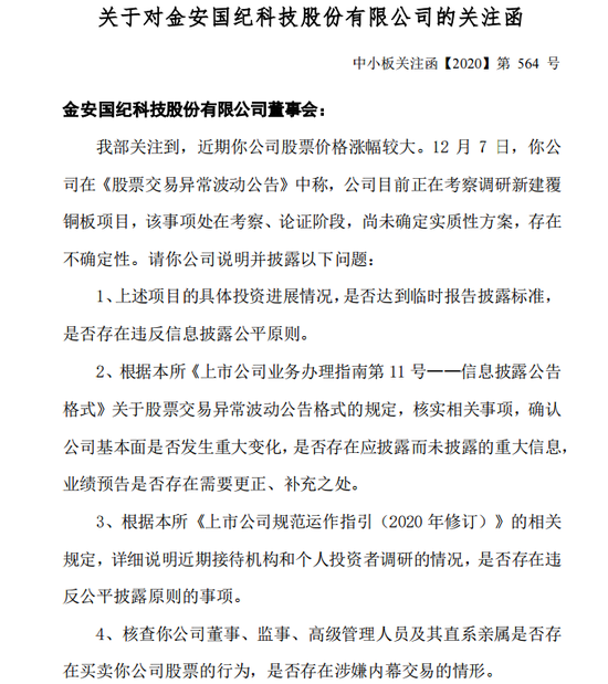 消息面上,因为覆铜板涨价被资金连续拉板,金安国纪于12月8日晚间收到关注函。