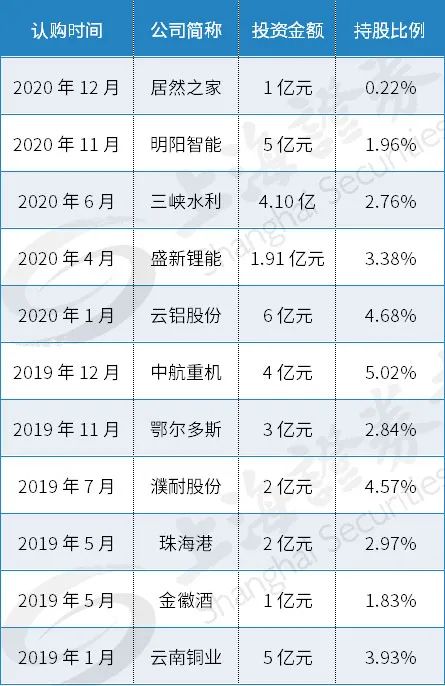 10月份出资5000万元参与川恒股份定增询价,11月成功获配5亿元明阳智能定增,12月又出资1亿元成为居然之家定增的认购方。