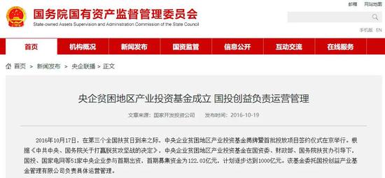 2016年10月17日,按照《中共中央国务院关于打赢脱贫攻坚战的决定》及其分工落实方案,由国务院国资委牵头,财政部和国务院扶贫办参与发起,51家中央企业参与首期出资设立了央企扶贫基金,首期出资额122.03亿元。